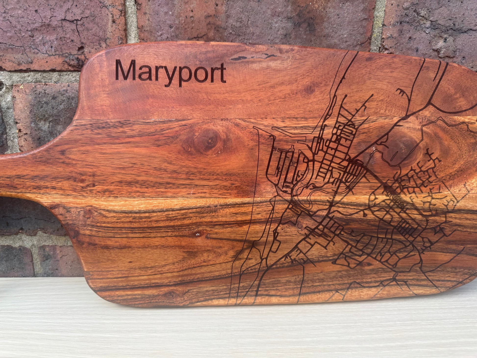 Introducing the Maryport Map Chopping Board! Crafted with high quality acacia wood, this board features a laser engraved map of Maryport. Perfect for displaying your love for the town while providing a durable surface for chopping and meal prep. Upgrade your kitchen with this stylish and functional addition.